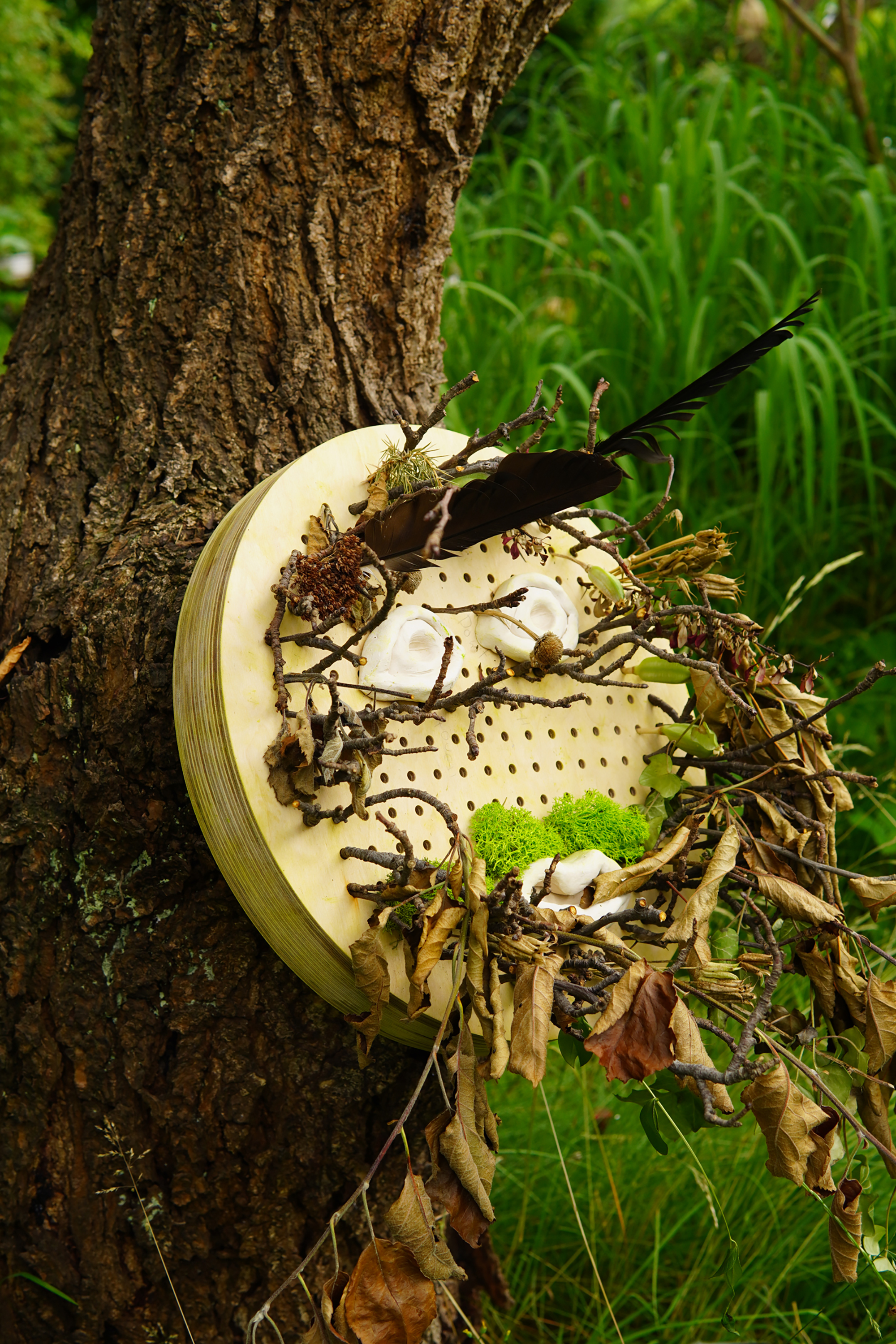 Allotment gardens are spaces of self-expression. With this in mind, a decorative element was created, a mask for a tree - a face that can be personalized. The design refers to the tradition of carving faces in tree trunks in northern Italy.