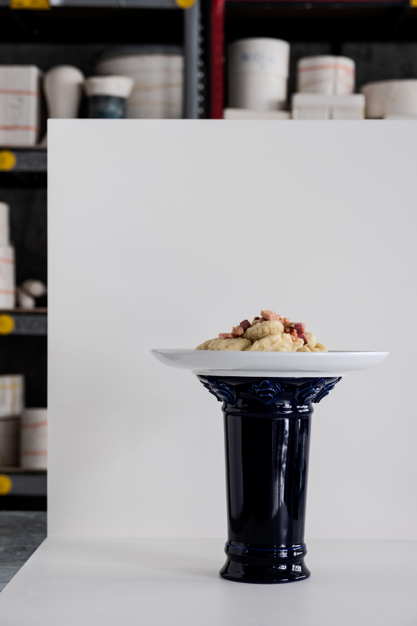 Chciałam dosłownie zinterpretować temat, jednocześnie nawiązując do dziedzictwa ludowego Wielkopolski, skąd pochodzi ta tradycyjna potrawa. Stworzyłam cokół w kształcie kolumny, na którym można położyć talerz lub pojedynczą kluskę, w zależności od pożądanego efektu. Bazę zdobi ornament zaczerpnięty z haftu krajeńskiego, tradycyjnego dla okolic Złotowa.
